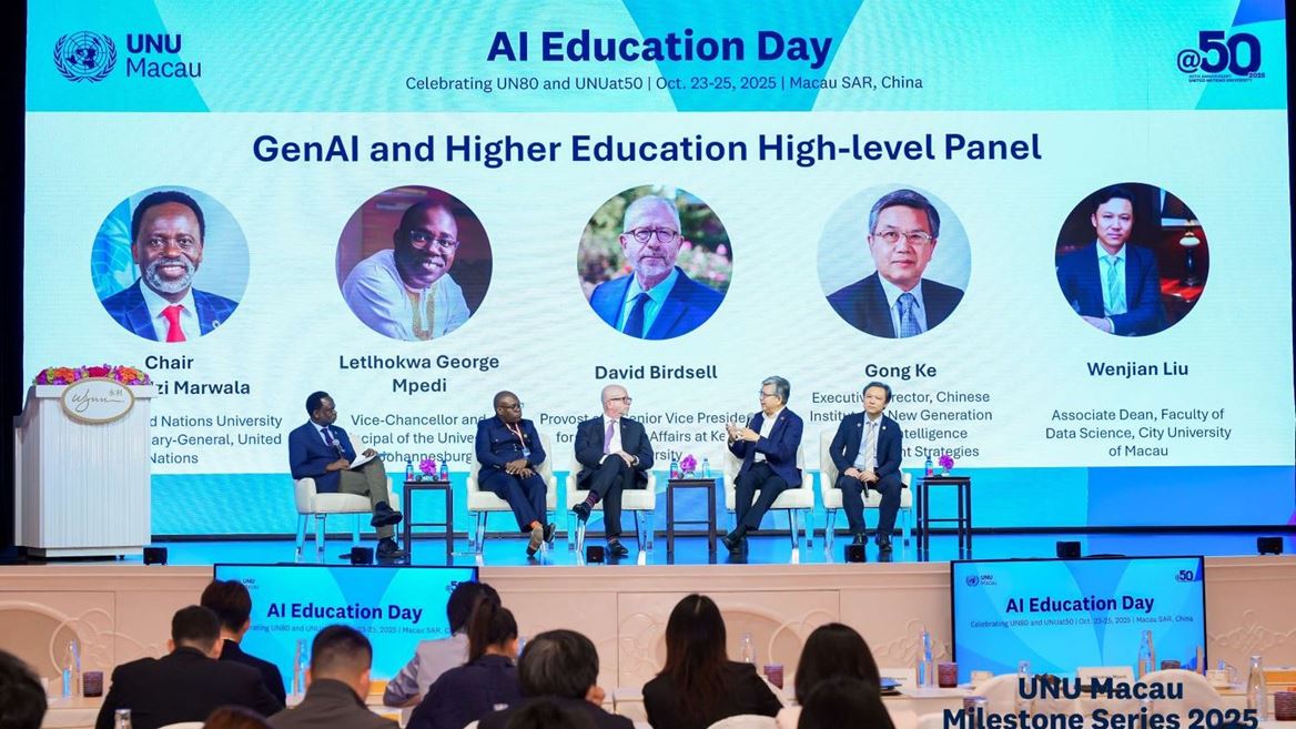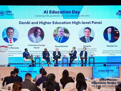 The UNU Macau AI Education Day was held on October 25, attracting students of all ages, educators, and policymakers for a full-day of immersive learning and intergenerational dialogue, exploring the innovative applications and future development of artificial intelligence in education. The high-level plenary session, “Generative AI and Higher Education,” chaired by Prof. Tshilidzi Marwala, UNU Rector and UN Under-Secretary-General, was the highlight of the day. Global education leaders shared insights on how generative AI is reshaping learning ecosystems, research models, and institutional strategies. Discussions focused on digital equity, ethical integration, and the adaptability of higher education systems. Prof. Marwala and Mr. Ernest Chan, Vice-President (Administration) of Lingnan University, unveiled the UNU Hub on Humanitarian Innovation and Technology at Lingnan University—the first UNU Hub in Asia. The Hub will serve as a regional platform for research, training, and policy innovation, focusing on technology-based solutions to humanitarian challenges.