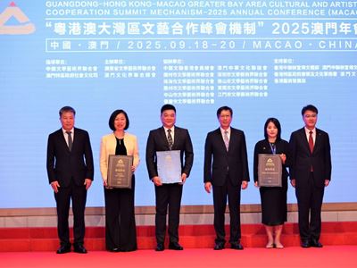 Macao, October 3, 2025 – The “Guangdong-Hong Kong-Macao Greater Bay Area Cultural and Artistic Cooperation Summit Mechanism – 2025 Annual Conference (Macao)” was held in the city from September 19 to 20, where Wynn’s cultural brand “Wynn Culture” was selected to join the mechanism as a new member and was awarded a plaque in recognition of this honor. This marked the wide-ranging acknowledgement of Wynn Culture for its efforts in driving the development of culture and arts, and will further deepen Wynn Culture’s commitment to the cultural and artistic exchange, collaboration and innovation in the Greater Bay Area.