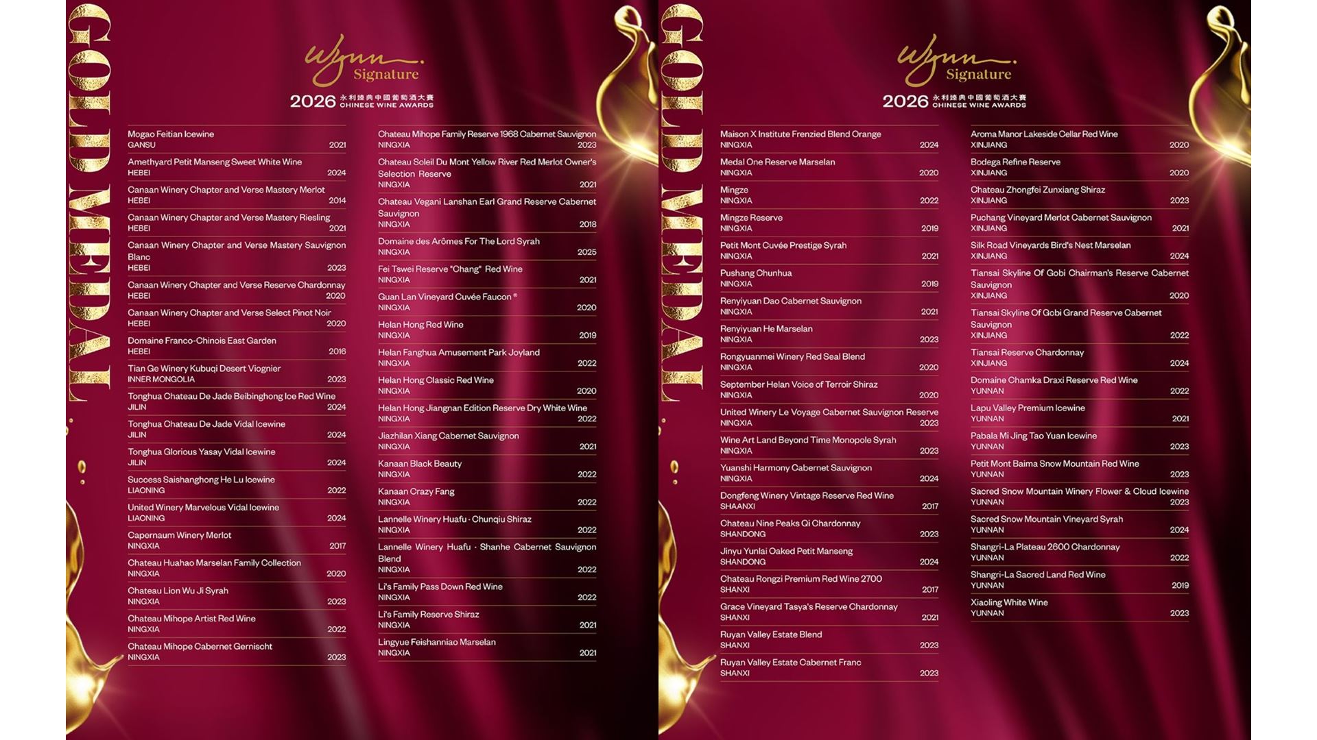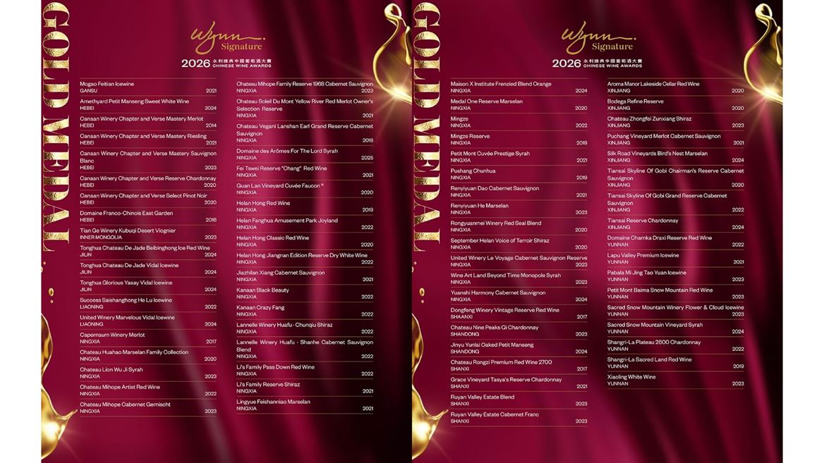 Macao, March 31, 2026 — Following an intense judging week in early March, the 2026 Wynn Signature Chinese Wine Awards, a "Wynn Signature" lifestyle brand creation, is pleased to now unveil its list of the Gold, Silver, and Bronze medal winners. This announcement marks the final stage of the competition, setting the stage for the official awards ceremony at Wynn Palace on April 24, where 36 coveted trophies will be bestowed upon China's leading wineries.