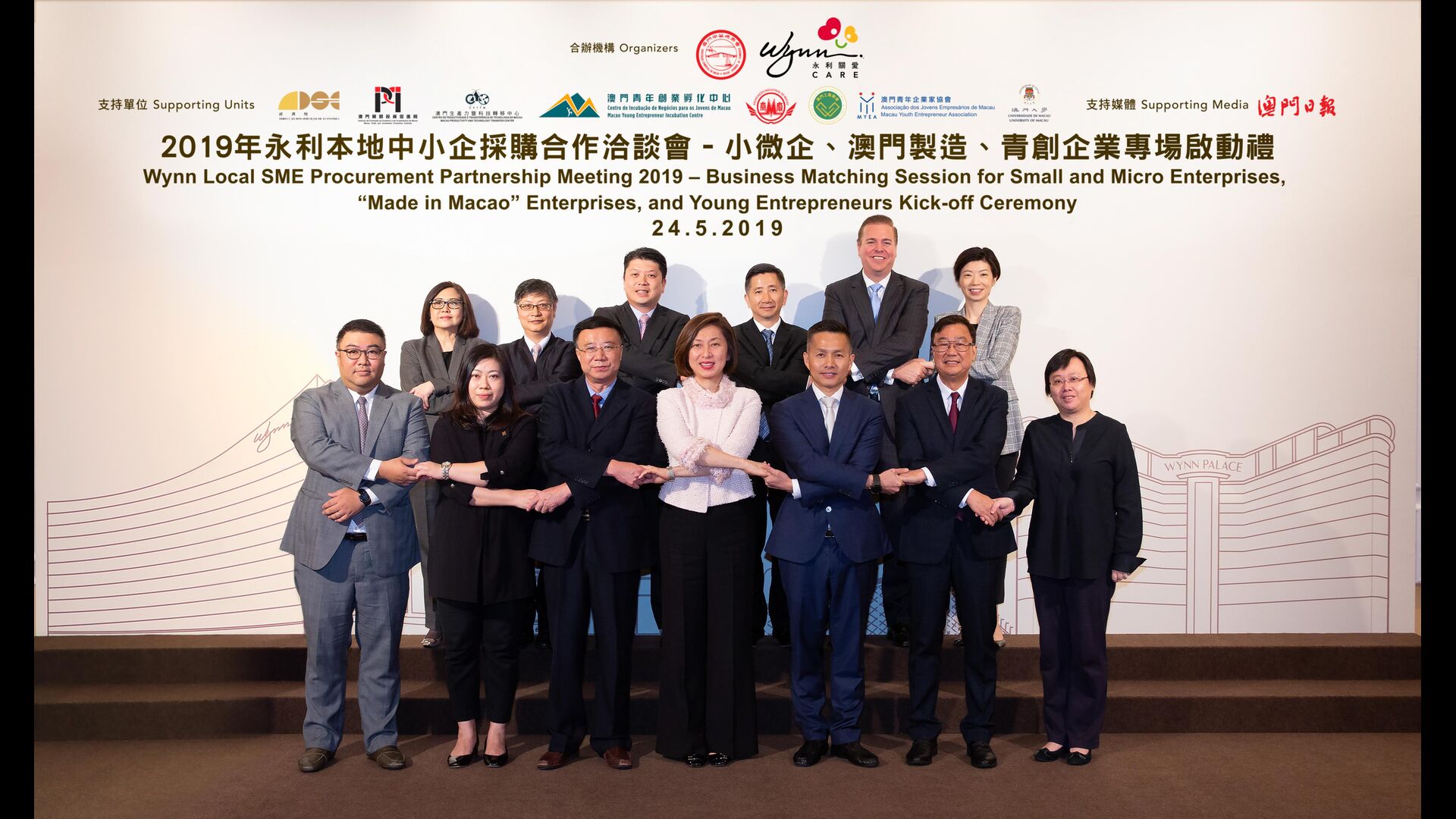 出席活动的嘉宾包括:中联办经济部副部长徐俊先生、澳门特别行政区政府经济局局长戴建业先生、澳门中华总商会副理事长徐达明先生、澳门贸易投资促进局企业拓展服务处经理梁礼珊女士、澳门生产力暨科技转移中心高级经理李蔼伦女士、澳门青年创业孵化中心行政总裁林家伟先生、澳门厂商联合会副理事长黄若礼先生、澳门青年企业家协会监事长崔世健先生、澳门工商联会会长何敬麟先生、澳门日报副总经理林耀明先生、永利澳门有限公司副主席兼执行董事陈志玲女士、永利渡假村(澳门)股份有限公司财务高级副总裁金骏豪先生、永利澳门财务高级副总裁郭启邦先生、永利澳门及永利皇宫推广传讯高级副总裁廖晓龄女士,以及永利澳门及永利皇宫采购行政总监陈金莺女士。