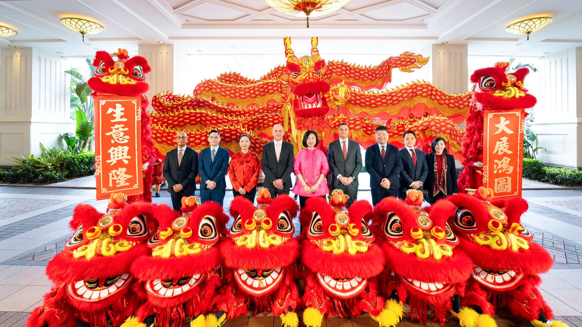 伴隨激昂鑼鼓節奏,醒獅隊伍昂首騰躍,炮竹齊鳴,營造熱烈節慶氣氛。龍獅隊伍隨後巡遊兩大度假村核心區域,呈獻傳統「採青」技藝,向賓客送上馬年吉祥祝福,寓意龍馬精神、生意興隆。